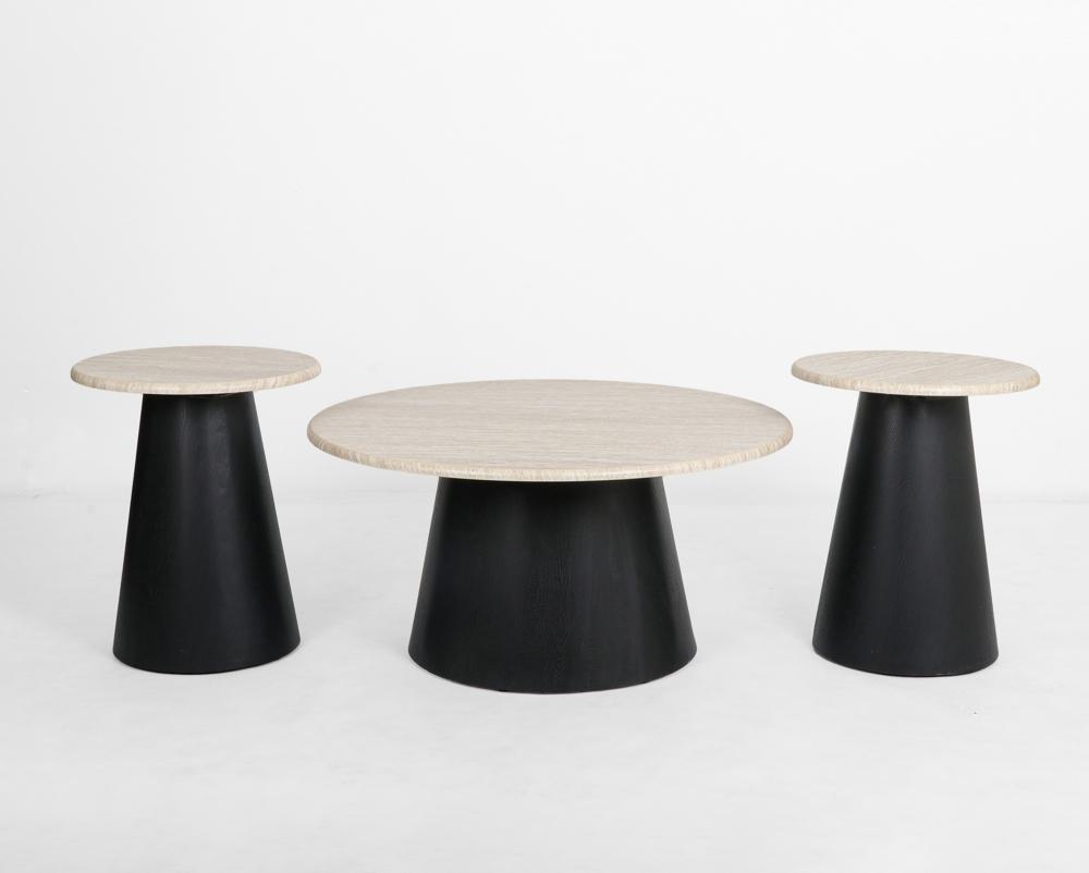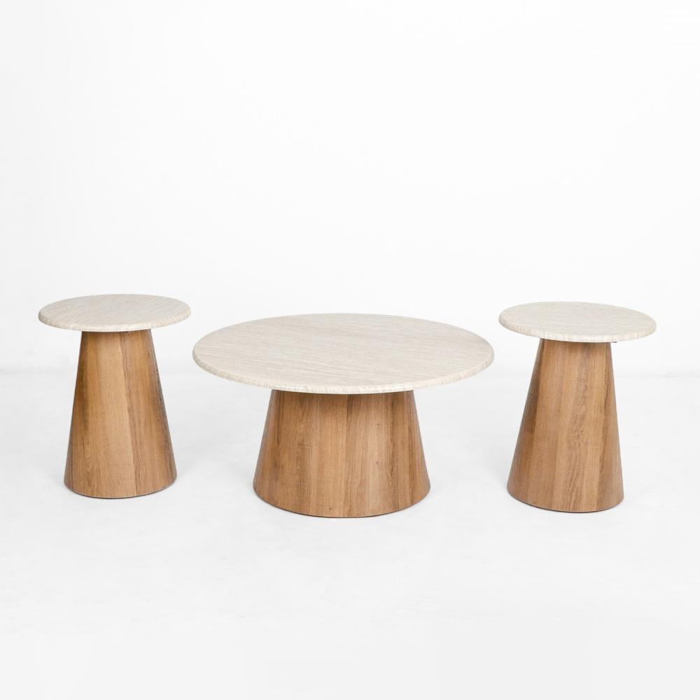 أضف لمسة فنية وعصرية إلى منزلك مع هذه الطاولات الأنيقة بتصميمها المميز. تأتي الطاولة بسطح خشبي بلون طبيعي أنيق وقاعدة مخروطية سوداء تضيف ثباتاً وأناقة. تصميمها البسيط والراقي يجعلها مثالية لغرف المعيشة أو الزوايا العصرية. سواء اخترت الطاولة الكبيرة أو الصغيرة، أو الطقم الكامل، ستحصل على قطعة أثاث تجمع بين الجمال والعملية.
