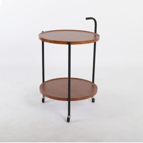 عربة ضيافة و تقديم دائرية بتصميم بسيط وأنيق. العربة تتكون من رف علوي وآخر سفلي من الخشب ذو سطح مستوي، مدعومة بأربعة أعمدة معدنية سوداء. عربة تقديم ضيافة تحتوي على مقبض معدني من جهة واحدة لتسهيل حركتها. بالإضافة إلى ذلك، تحتوي العربة على أربع عجلات صغيرة تساعد في تحريكها بسهولة من مكان إلى آخر.