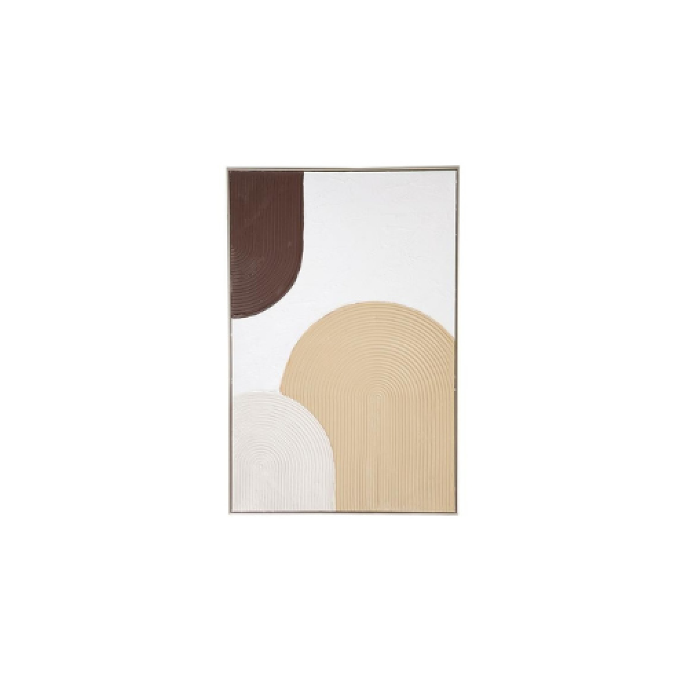 تتميز اللوحة بأشكال دائرية كبيرة وجذابة، تشمل ألوانًا مثل البني، والبيج، والكريمي، بالإضافة إلى خلفية بيضاء بسيطة. الاستخدام الرائع لملمس السطح عبر الخطوط المتوازية المتواجدة في كل شكل يعطي للوحة بعدًا جماليًا إضافيًا، مما يجعل العين تتنقل بين الأشكال وتكتشف تفاصيل جديدة.