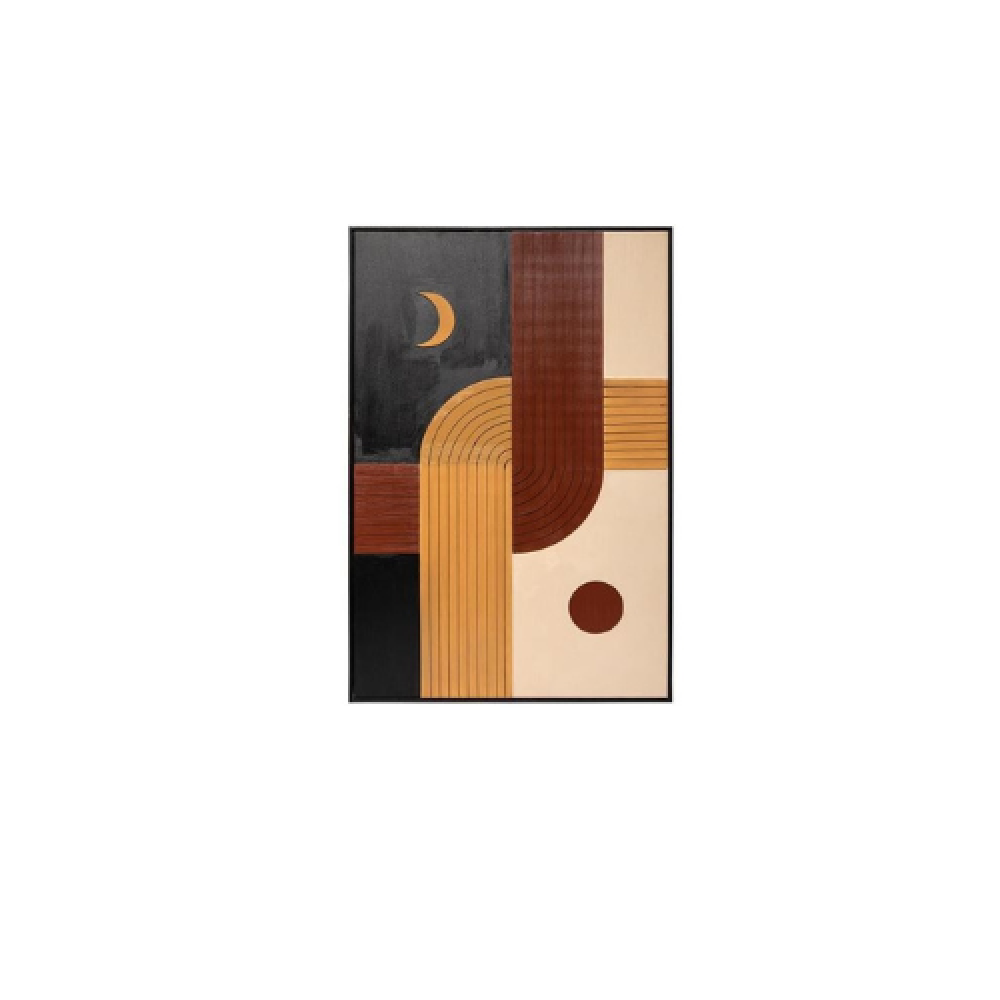 تتكون اللوحة من تباينات لونية جذابة تشمل الألوان الزاهية مثل البرتقالي، والبني، واللون الأسود والبيج. هذه الألوان تتناغم بشكل جميل لتعكس تجربة بصرية غنية، حيث تُبرز الأشكال الدائرية والمستقيمة التي تخلق تنسيقًا بصريًا مدهشًا. يظهر في الجزء العلوي شكل هلال رقيق بلون ذهبي، مما يضيف لمسة من السحر والغموض للعمل.